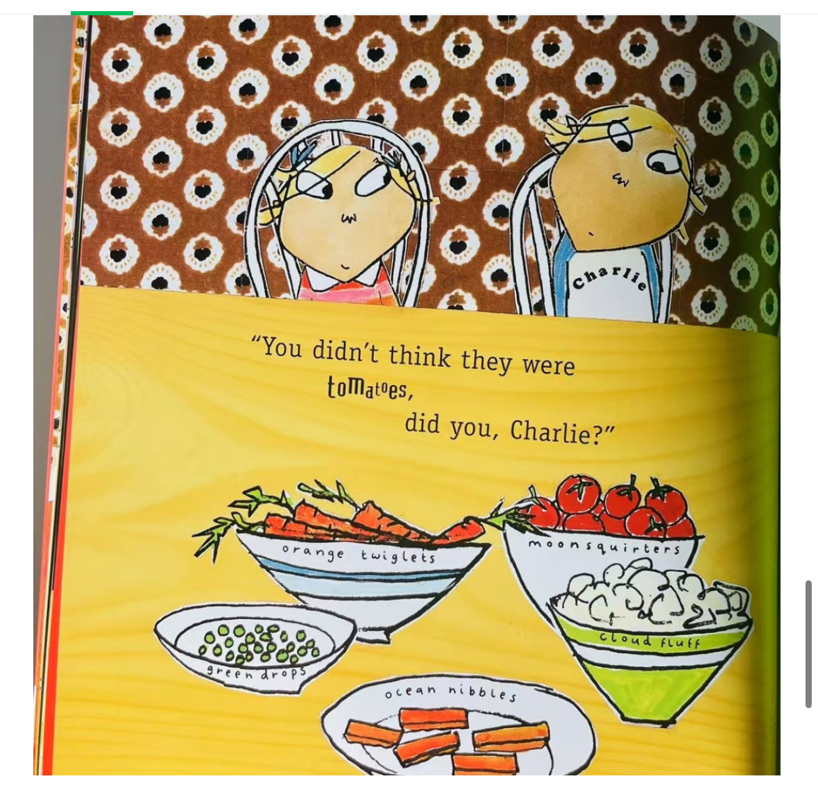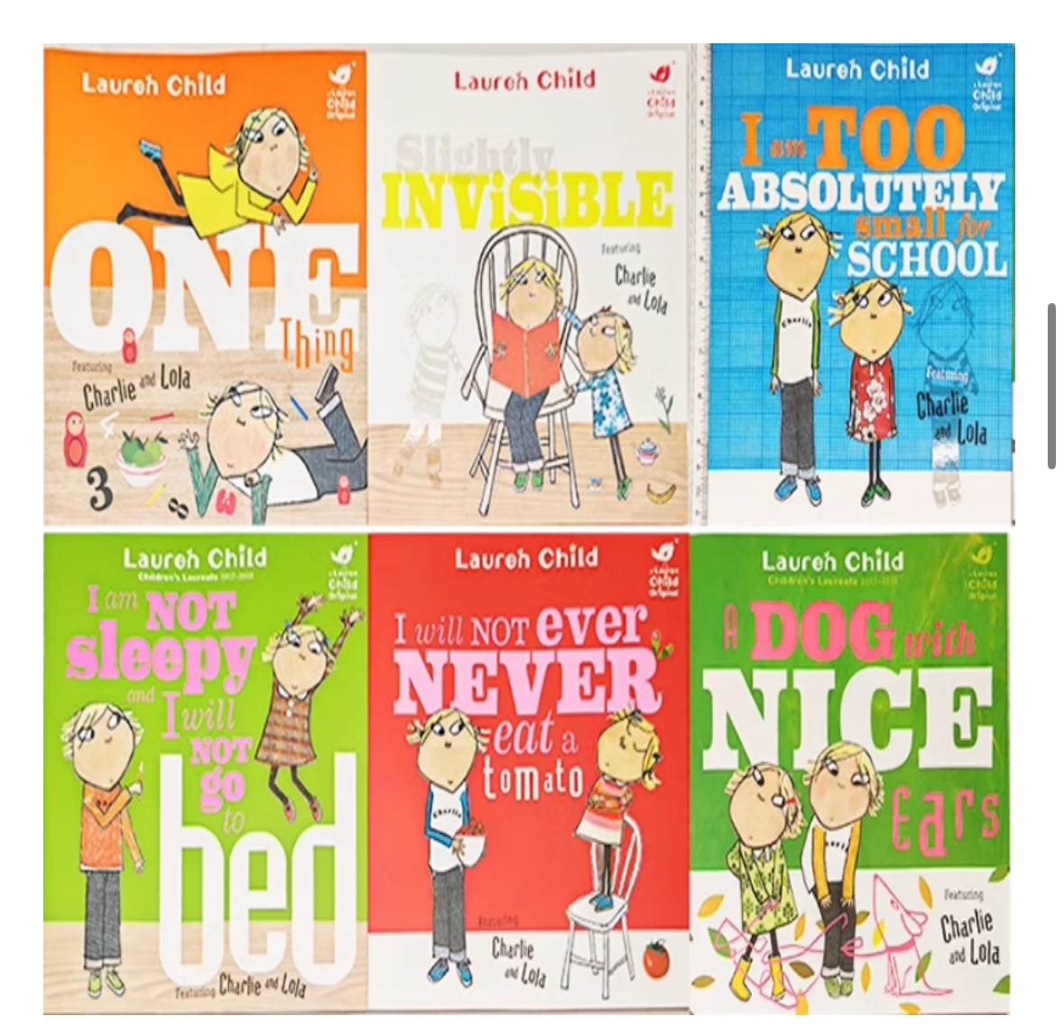 Charlie and Lola 1. I Will Never Not Ever Eat a Tomato 2. I am Too Absolutely Small for School 3. I Am Not Sleepy and I Will Not Go to Bed 4. Absolutely One Thing 5. Slightly Invisible 6. A Dog With Nice Ears